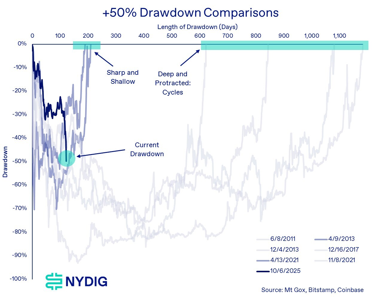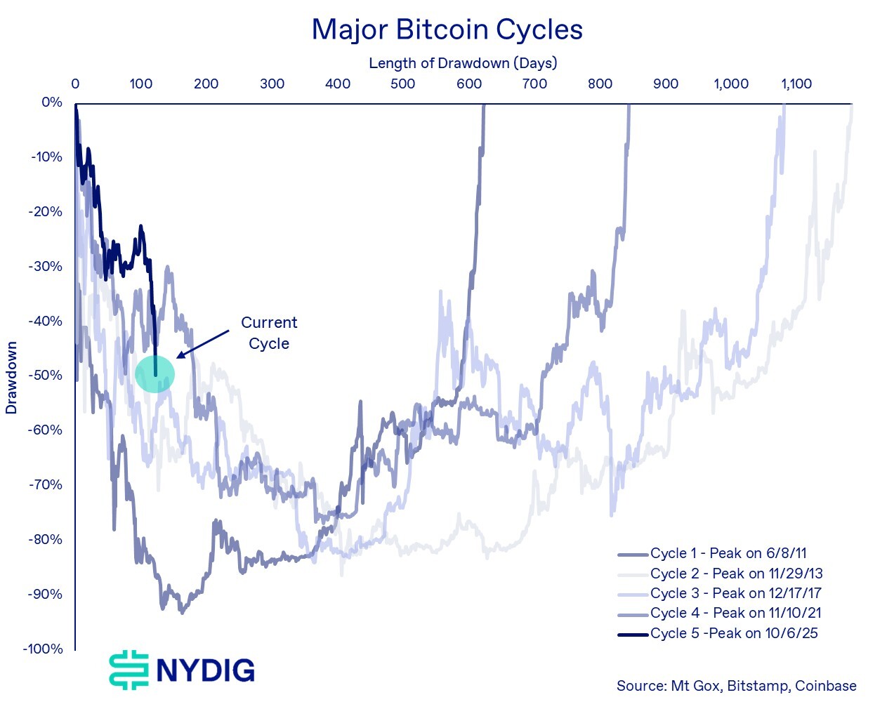 We believe the market is firmly in a cyclical drawdown consistent with bitcoin’s historical four-year cycle. Both the depth and duration of the decline support this view.