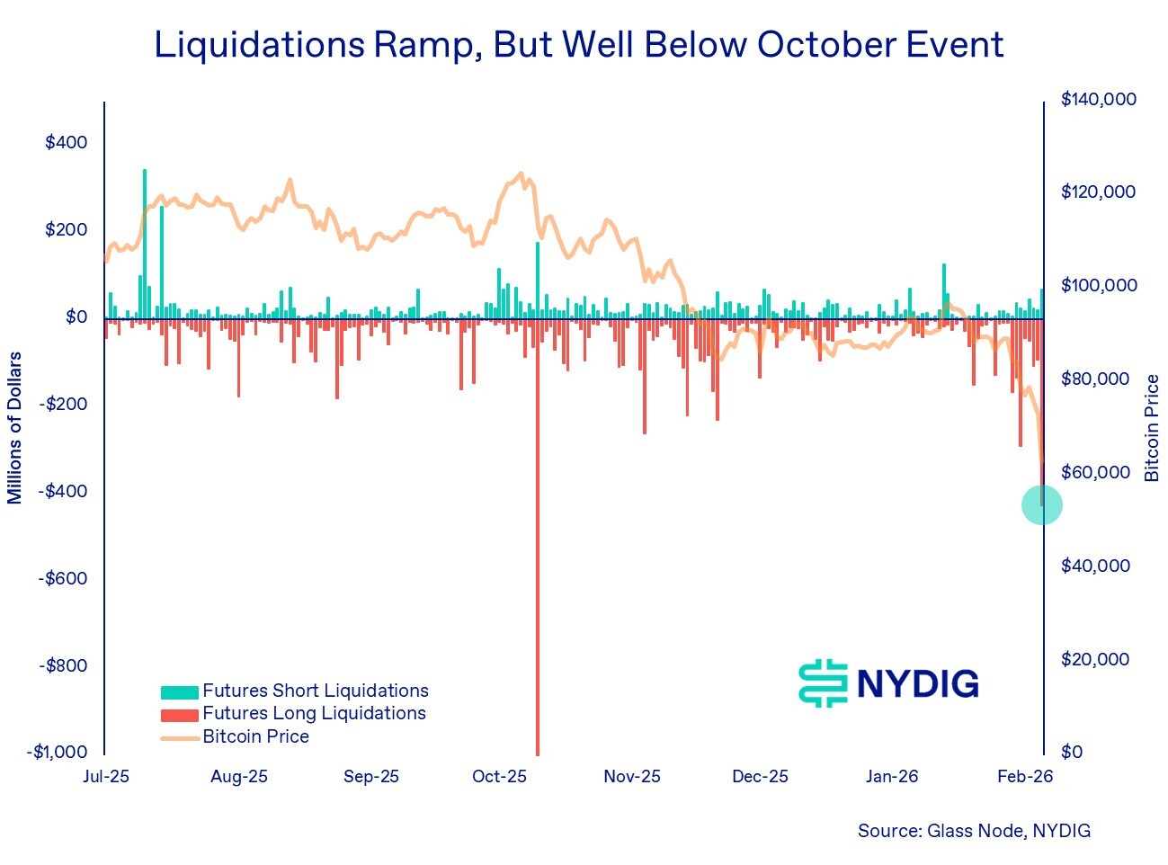 Liquidations accelerated rapidly as prices broke below key technical levels. The magnitude and velocity of forced selling resemble prior deleveraging events, reinforcing the role of derivatives-driven reflexivity rather than a gradual repricing of fundamentals. Data from Glass Node shows long futures liquidations of $427M, high but well below the $1B of BTC liquidations that were logged on the October 10th deleveraging event.