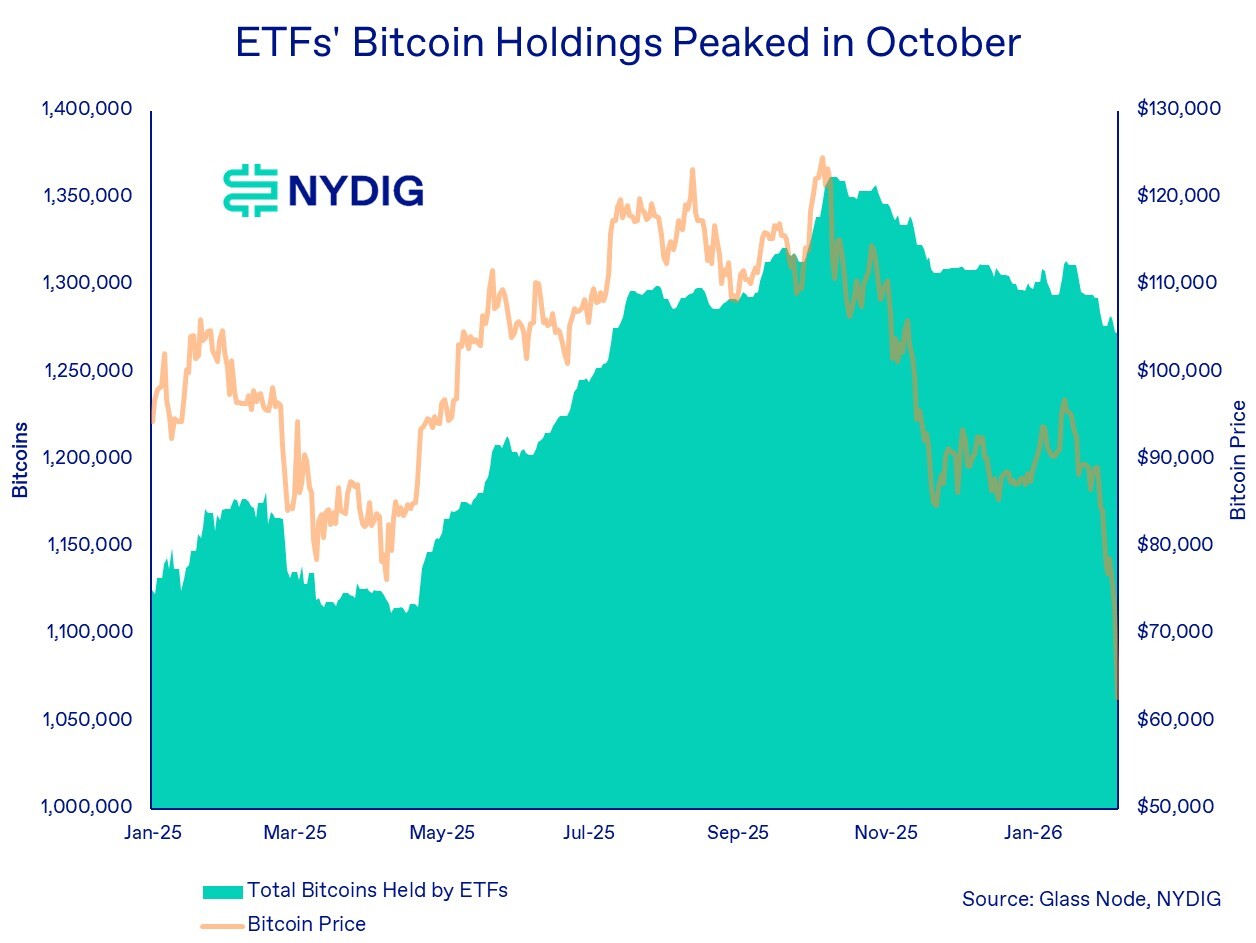 The spot ETF complex’s aggregate bitcoin holdings peaked in October and have been declining since. Since mid-January, spot ETFs have posted consistent outflows, so another round of outflows on Thursday was not surprising. That said, the magnitude was relatively modest given the scale of ETF trading volume and the sharp price moves. In total, the spot ETF complex saw just $434 million in outflows, small compared with the secondary-market trading activity that day. A key driver was IBIT.