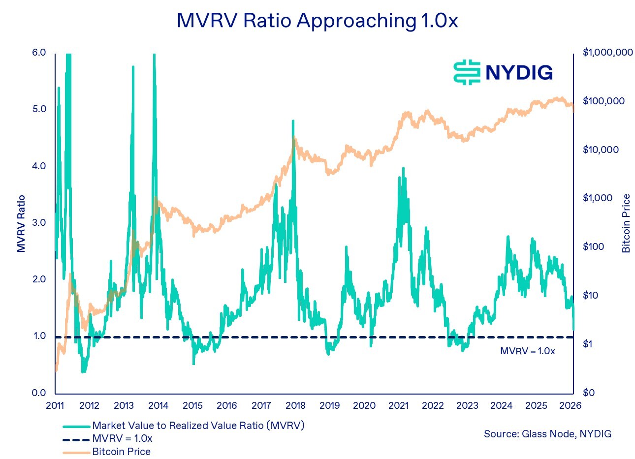 Another important level to watch is the 1.0x MVRV threshold. While this level will shift over time, we include it here based on where it stands today.