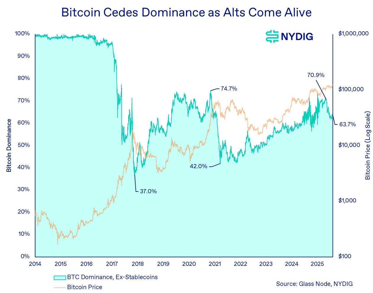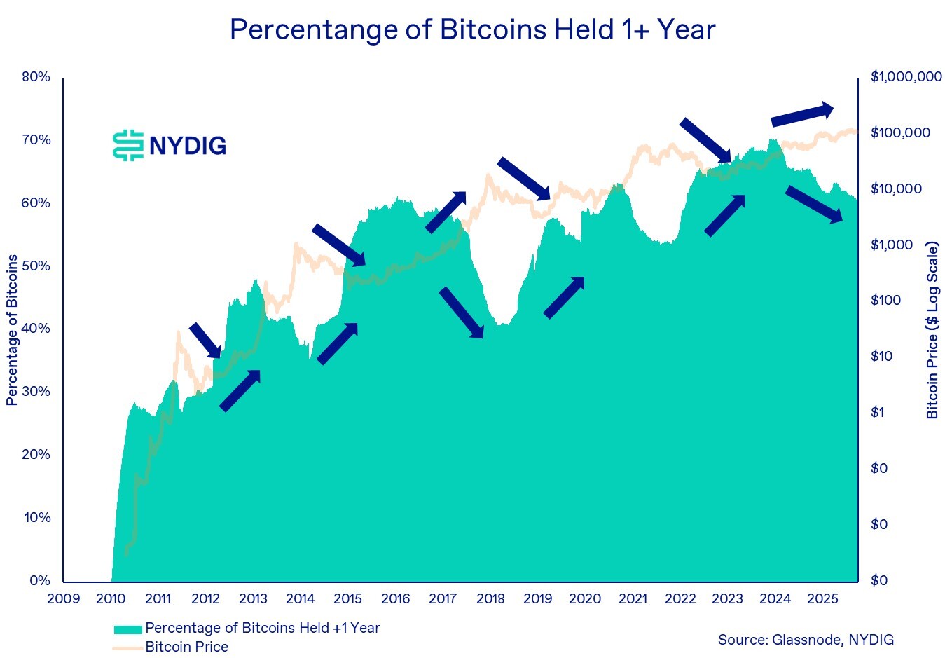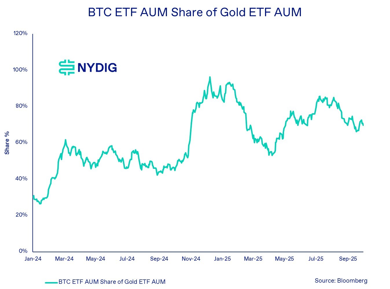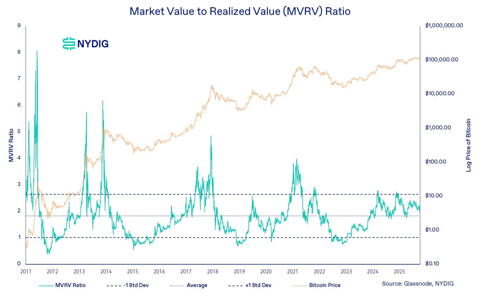 Conversely, total and change-adjusted transfer volumes (per Glass Node’s methodology) are rising, and entity-adjusted transfer volume (again per Glass Node’s methodology) is near all-time highs. In our view, this points to fewer entities moving larger amounts of bitcoin, consistent with the ongoing shift toward institutional and corporate usage, including ETFs, corporate treasuries, and bitcoin-focused DATs.