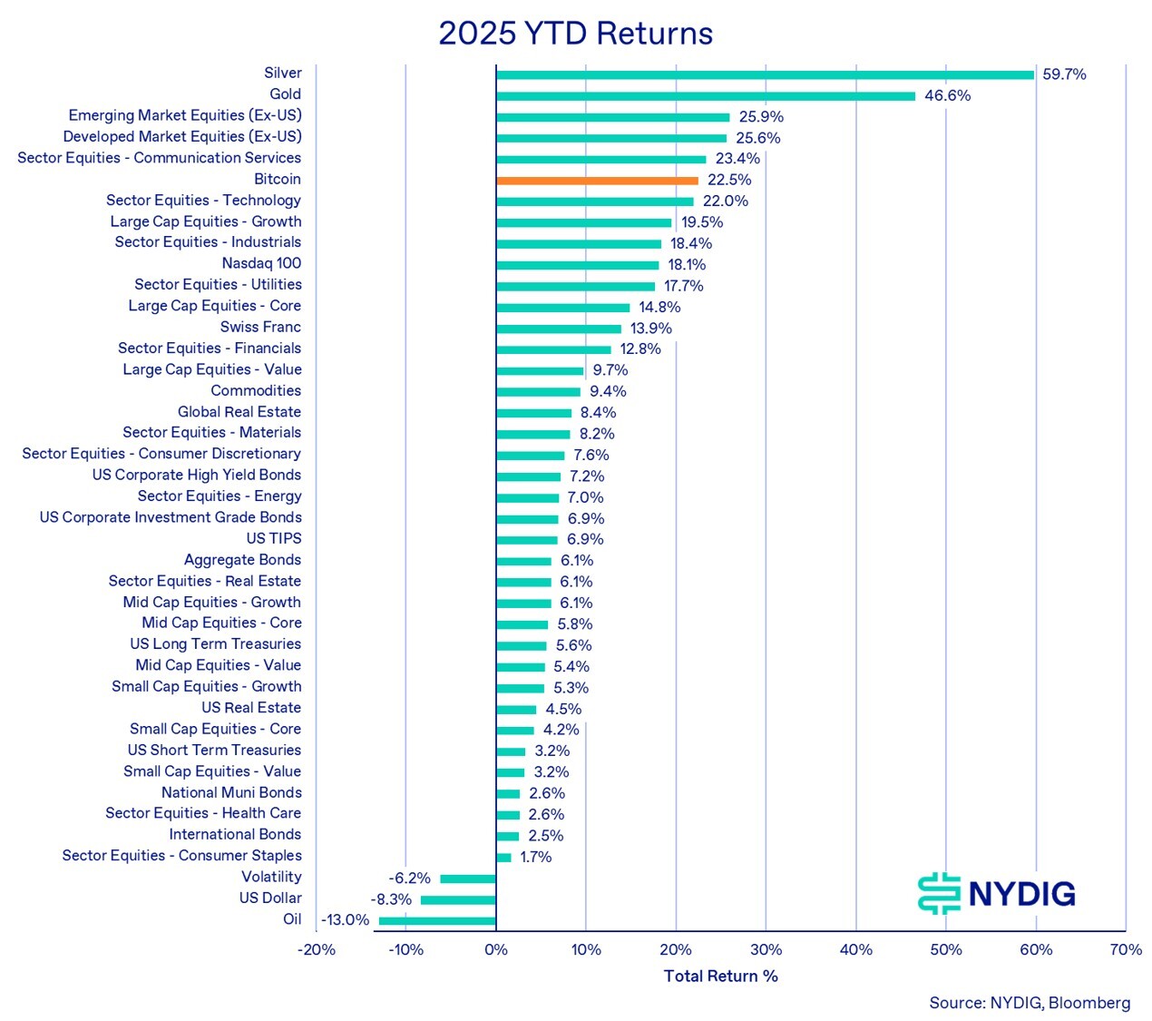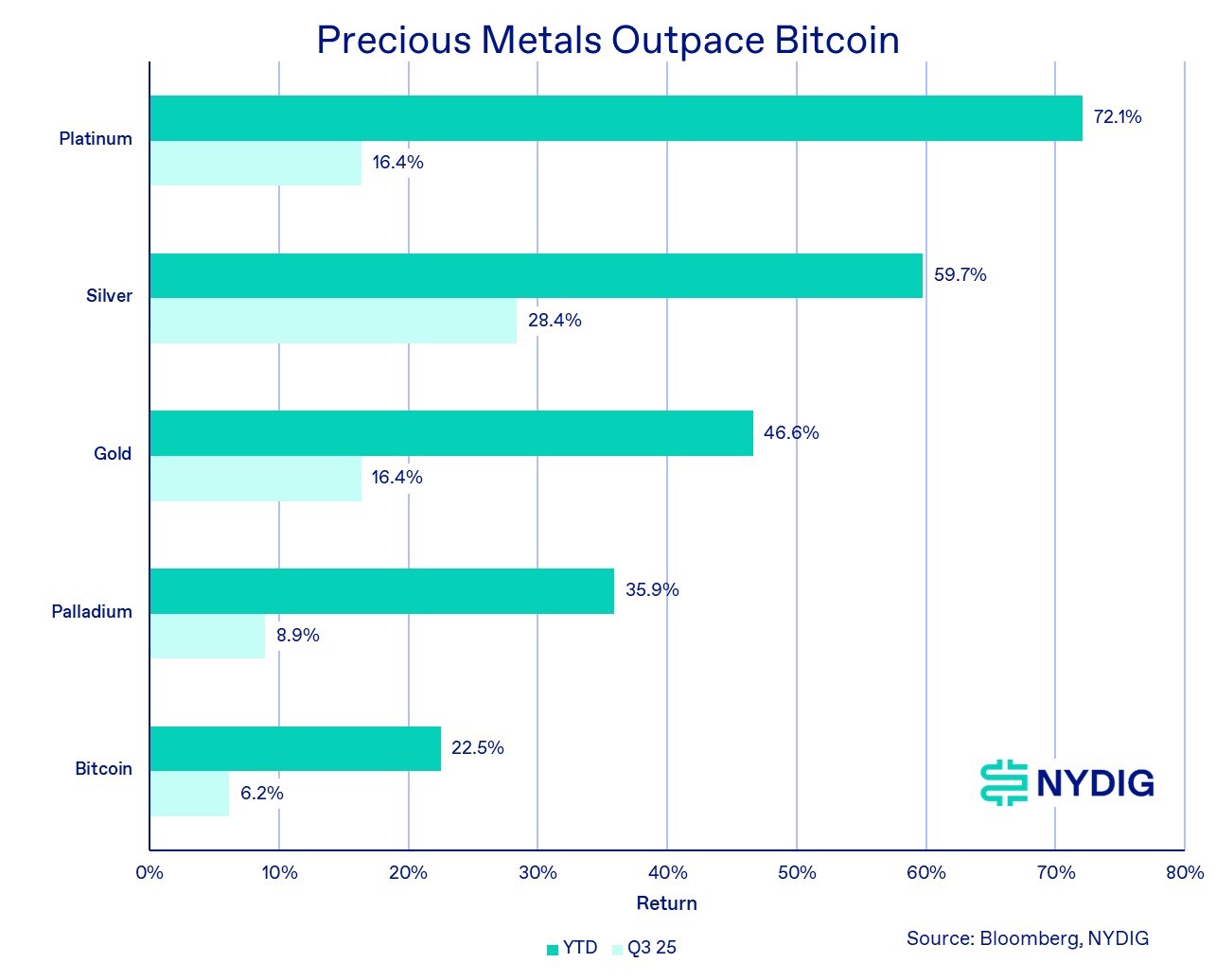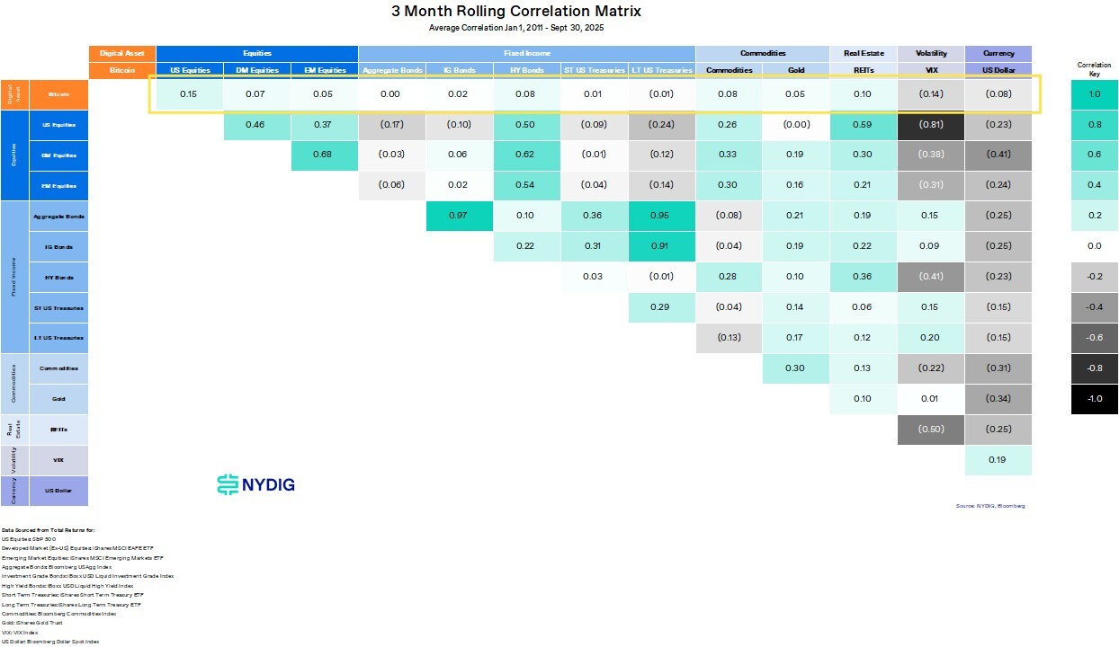 The final notable development this quarter involved options position limits on several spot bitcoin ETFs. Previously, traders were restricted to 25,000 contracts per ETF, but the SEC has now increased those limits by 10x for select funds. This adjustment is expected to further dampen bitcoin’s volatility, which has already been in secular decline throughout the year. In turn, this could enhance the attractiveness of structured products linked to bitcoin and bolster the asset’s role within risk-parity and multi-asset portfolios. However, it may also place continued pressure on certain derivatives strategies, such as covered-call selling, which tend to benefit from higher volatility.