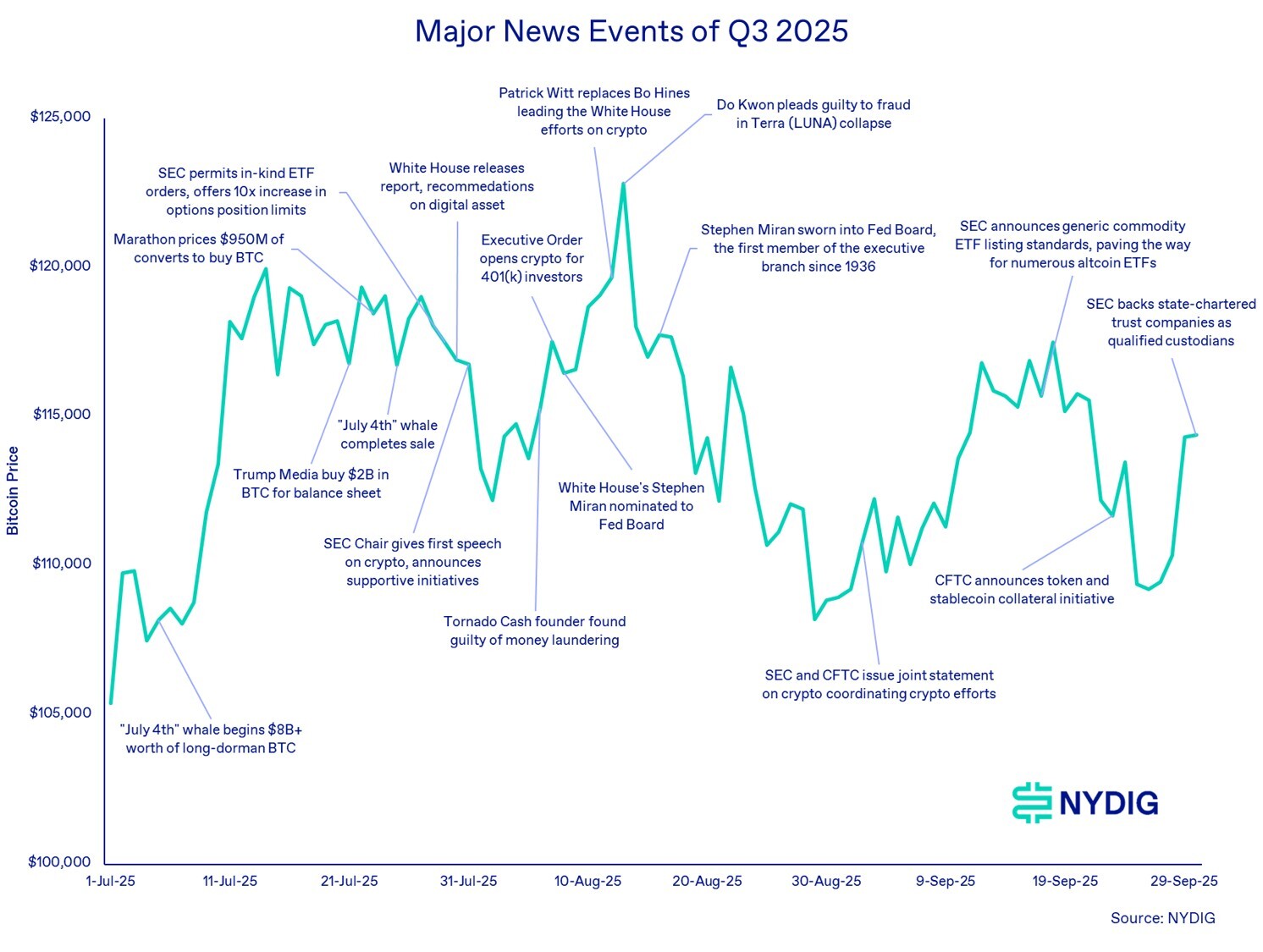 We highlighted this at the start of Q3, but it remains a key observation: despite the price of bitcoin reaching new all-time highs, on-chain network activity has not kept pace. This divergence suggests an ongoing financialization of the Bitcoin network within traditional finance.