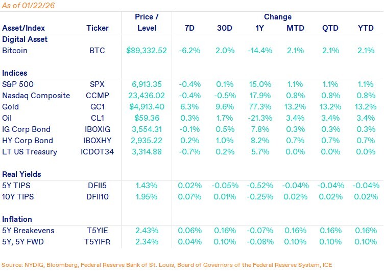 Over the weekend, markets were roiled after President Trump escalated trade rhetoric by threatening broad new tariffs on multiple European countries, a move tied to renewed geopolitical pressure related to the U.S.’s interest in Greenland. The announcement sparked a sharp risk-off reaction across global markets, with U.S. equity futures selling off, volatility rising, crypto moving lower, and precious metals soaring. While Trump later partially walked back the tariff threats, helping markets stabilize, a move that defines his negotiation tactics, the episode reinforced how abrupt policy rhetoric can still drive short-term volatility for crypto investors, even absent direct crypto-specific implications.